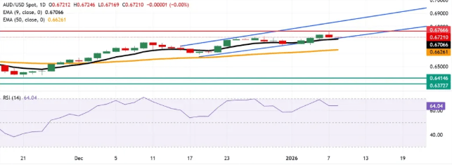 Initial support is found at the nine-day Exponential Moving Average (EMA) near 0.6708, followed by the lower boundary of the ascending channel at about 0.6700. A drop below this combined support zone could push the pair down toward the 50-day EMA level at approximately 0.6625.