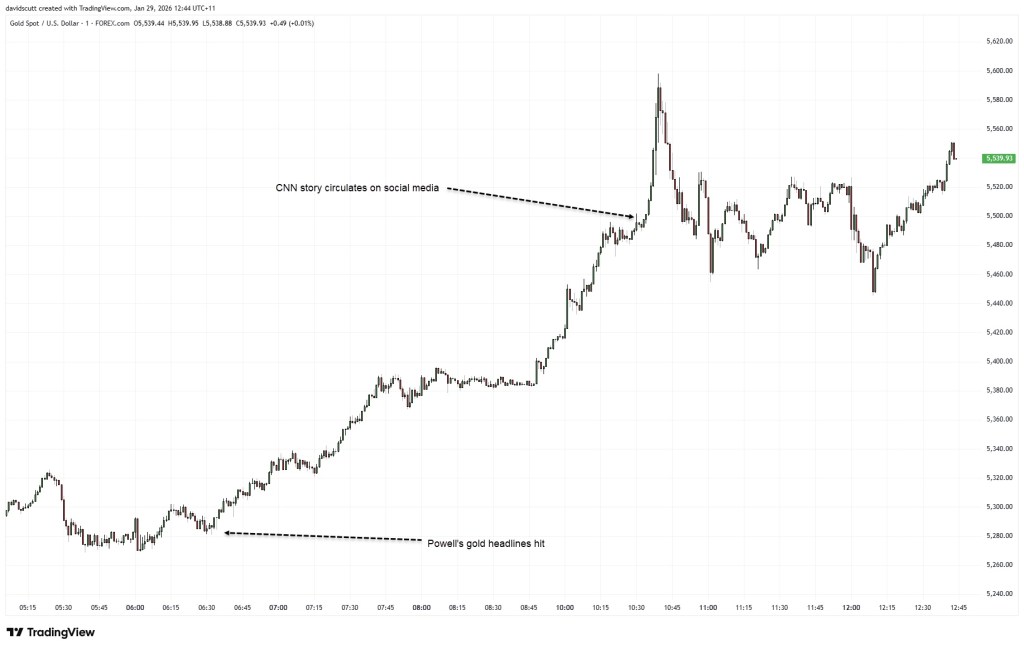 Some traders also cited comments from Fed Chair Jerome Powell after the January FOMC meeting, in which he downplayed any macroeconomic signal from gold’s record highs. Still, those remarks seem to have played only a minor role, coming several hours before the most volatile phase of the price action unfolded.