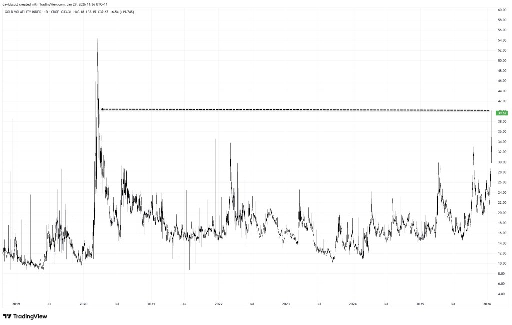 As illustrated above, the Gold Volatility Index (GVZ) has climbed to its highest level since the early days of the COVID-19 lockdowns in 2020, highlighting just how extreme price action in the traditional safe haven has become. GVZ measures implied volatility in gold options, offering insight into the magnitude of price swings the options market is anticipating. The surge suggests the market has entered a markedly different volatility regime, one in which unusually large moves are occurring with increasing frequency.