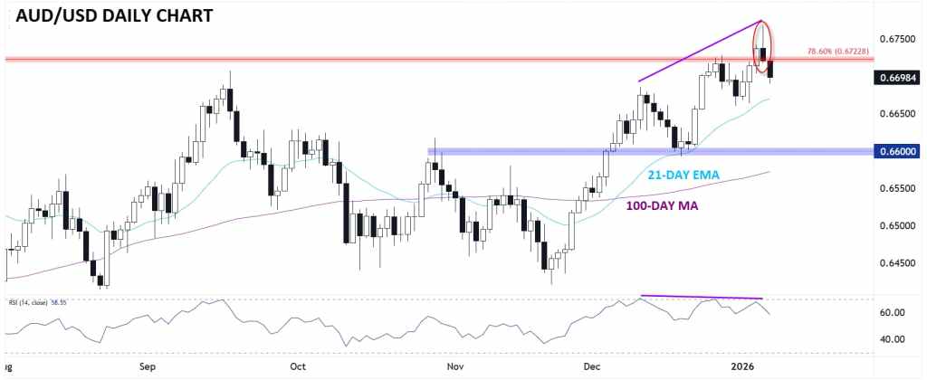 Risks: The AUD remains highly sensitive to global risk sentiment. A sharp deterioration in risk appetite, renewed concerns over China’s outlook, or an unexpected resurgence in the U.S. dollar could quickly unwind recent gains.