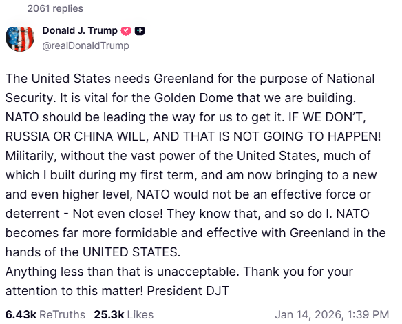 Across much of South America, governments are edging closer to Washington, leaving Brazil increasingly isolated. This is significant given President Lula’s openly left-leaning stance and his consistent alignment with Russia, China, and Iran. Following Trump’s capture of Maduro, betting markets on Kalshi assign a 90% probability that the presidents of Colombia and Peru will be out of office before 2027. At the same time, President Trump has again stated that Greenland should become part of the United States, reinforcing a broader strategy centered on securing critical assets.